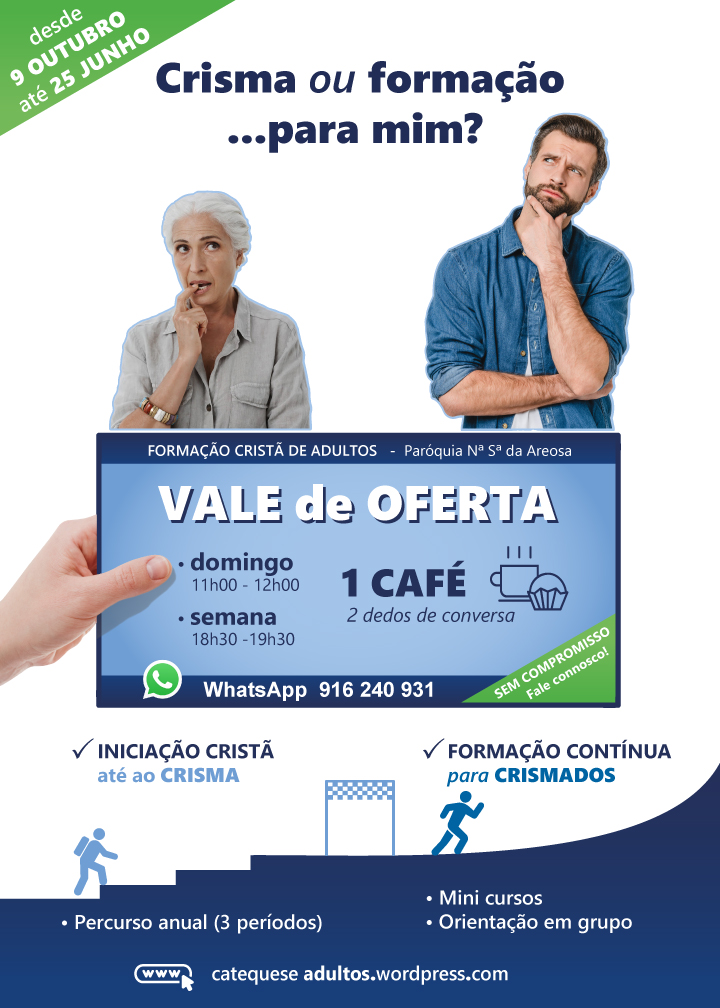 A formação cristã de adultos da Paróquia Nª Sª da Areosa irá iniciar no dia 9 de Outubro de 2022. É destinada a maiores de 18 anos (sem limite de idade) e divide-se em 2 grupos: