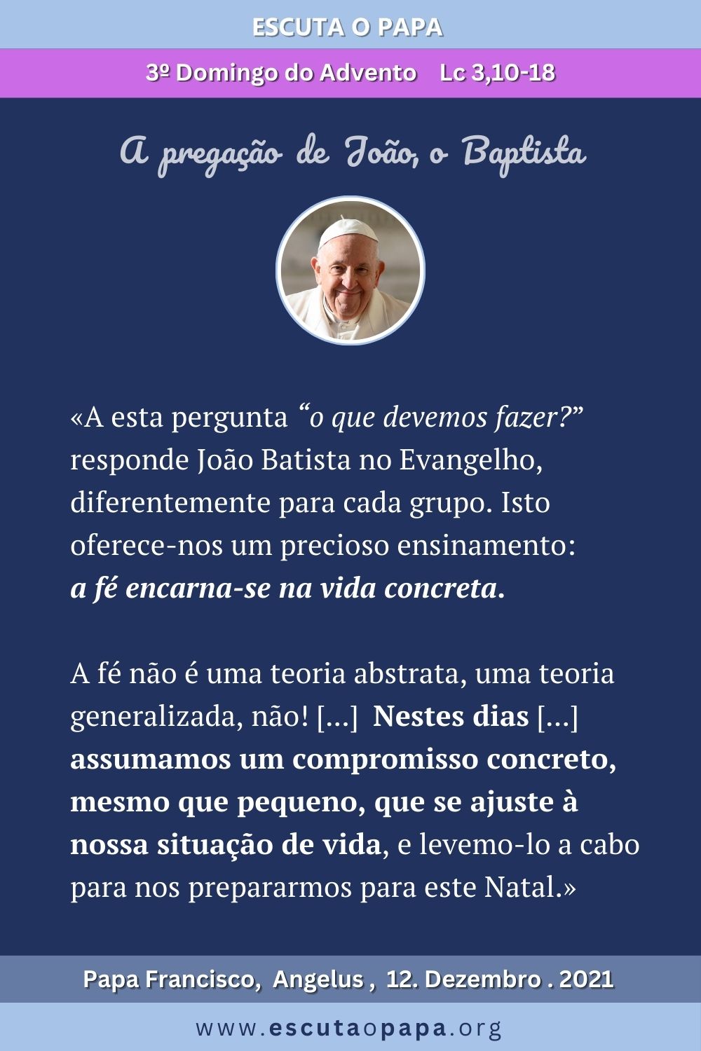 A esta pergunta “o que devemos fazer?” responde João Batista no Evangelho, diferentemente para cada grupo. […] A cada um foi dirigida uma palavra específica, relativa à situação real da sua vida. Isto oferece-nos um precioso ensinamento: a fé encarna-se na vida concreta. Não se trata de uma teoria abstrata. A fé não é uma teoria abstrata, uma teoria generalizada, não, a fé toca a carne e transforma a vida de cada um. Pensemos sobre a concretismo da nossa fé. A minha fé: é algo abstrato ou concreto?[…] Perguntemo-nos: o que posso fazer concretamente? [..] Nestes dias […] assumamos um compromisso concreto, mesmo que pequeno, que se ajuste à nossa situação de vida, e levemo-lo a cabo para nos prepararmos para este Natal. Por exemplo: posso telefonar àquela pessoa sozinha, visitar aquele idoso ou doente, fazer algo para servir um pobre […]. Ou ainda: talvez eu tenha um perdão a pedir ou a conceder, uma situação a esclarecer […]. Talvez tenha negligenciado a oração, e depois de tanto tempo é hora de me aproximar do perdão do Senhor. Irmãos e irmãs, encontremos algo concreto e realizemo-lo! Que nos ajude Nossa Senhora, em cujo ventre Deus se fez carne.