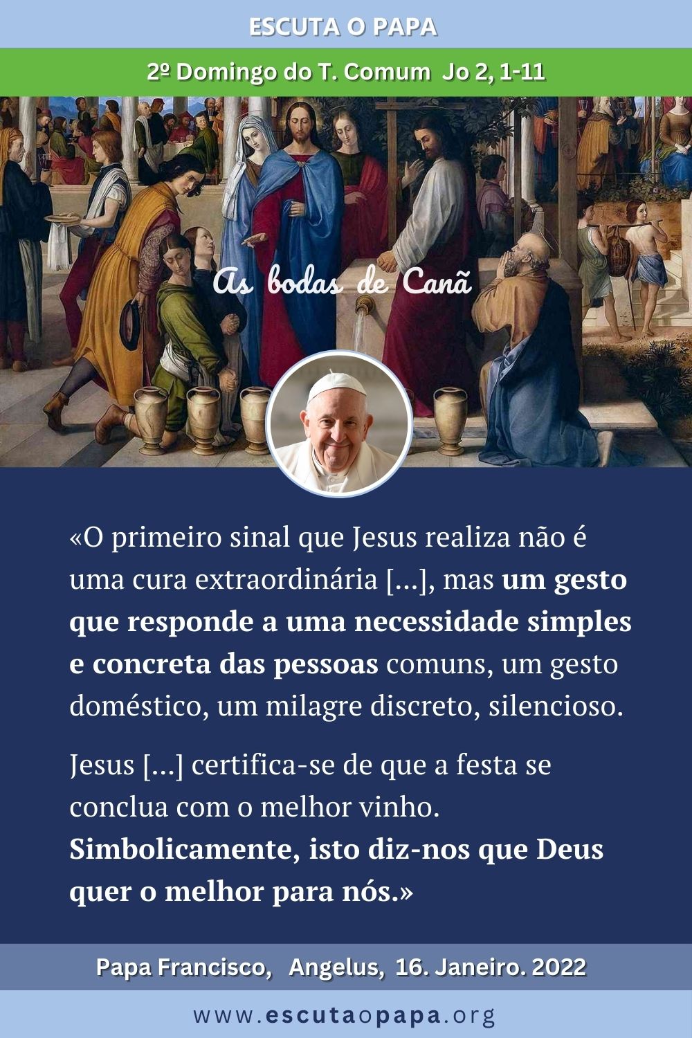 O Evangelho da liturgia de hoje relata o episódio das bodas de Caná, onde Jesus transforma a água em vinho para a alegria dos noivos. E conclui-se assim: «Este foi o início dos sinais que Jesus realizou; Ele manifestou a sua glória e os seus discípulos acreditaram nele» (Jo 2, 11). Observamos que o evangelista João não fala de um milagre. […] Ele escreve que em Caná ocorre um sinal que suscita a fé dos discípulos. […] Um sinal é um indício que revela o amor de Deus, isto é, que não chama a atenção para o poder do gesto, mas para o amor que o provocou. […] O primeiro sinal ocorre quando dois recém-casados se encontram em dificuldade no dia mais importante da sua vida. No meio da festa falta um elemento essencial, o vinho, e a alegria corre o risco de esvaecer no meio das críticas e da insatisfação dos convidados. […]