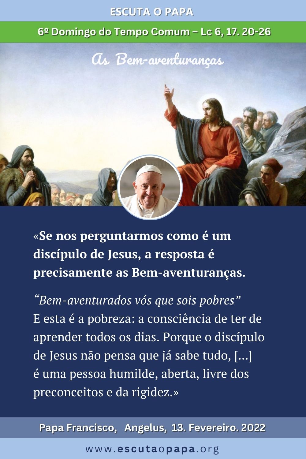 No centro do Evangelho da Liturgia de hoje estão as Bem-aventuranças (cf. Lc 6, 20-23). É interessante notar que Jesus, apesar de estar rodeado por uma grande multidão, proclama-as dirigindo-se «aos seus discípulos» […]. Com efeito, as Bem-aventuranças definem a identidade do discípulo de Jesus. Podem parecer estranhas, quase incompreensíveis para aqueles que não são discípulos, mas se nos perguntarmos como é um discípulo de Jesus, a resposta é precisamente as Bem-aventuranças. Vejamos a primeira, que é a base de todas as outras: «Bem-aventurados vós que sois pobres, porque vosso é o Reino de Deus!». […] Jesus diz que são bem-aventurados porque são pobres. Em que sentido? No sentido em que o discípulo de Jesus não encontra a sua alegria no dinheiro, no poder nem sequer noutros bens materiais, mas nos dons que recebe todos os dias de Deus. […] Também os bens que possui, é feliz de os partilhar, porque vive na lógica de Deus. E qual é a lógica de Deus? A gratuidade.[…] Esta pobreza é também uma atitude em relação ao sentido da vida, porque o discípulo de Jesus não pensa que já sabe tudo.[…] E esta é a pobreza: a consciência de ter de aprender todos os dias. O discípulo de Jesus […] é uma pessoa humilde, aberta, livre dos preconceitos e da rigidez. […]