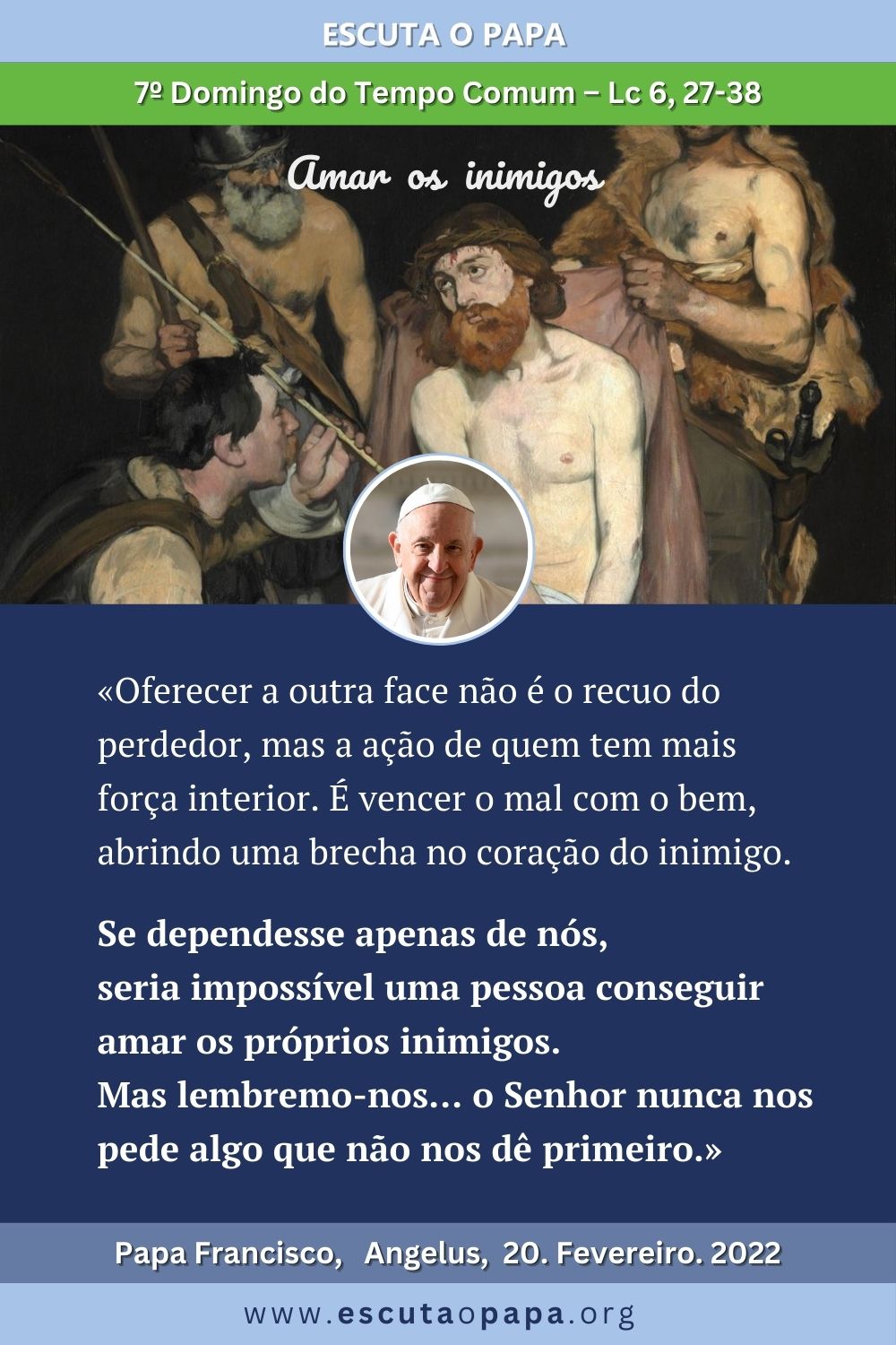 Passemos à outra objeção: é possível que uma pessoa consiga amar os próprios inimigos? Se dependesse apenas de nós, seria impossível. Mas lembremo-nos… […] o Senhor nunca nos pede algo que não nos dê primeiro. Quando Ele me diz para amar os inimigos, […] dá-nos a capacidade de amar. […] A força de amar, que não é algo, mas é o Espírito Santo. […] E com o Espírito de Jesus podemos responder ao mal com o bem, podemos amar quem nos fere. Assim fazem os cristãos. […] E quanto a nós, procuramos viver as exortações de Jesus? Pensemos numa pessoa que nos feriu. […]Talvez haja um ressentimento dentro de nós. Portanto, coloquemos este ressentimento ao lado da imagem de Jesus, manso, durante o julgamento, após a bofetada. E depois peçamos ao Espírito Santo que aja no nosso coração. Por fim, oremos por aquela pessoa: oremos por aqueles que nos feriram (cf. Lc 6, 28). […]. Rezar por quem nos feriu é o primeiro passo para transformar o mal em bem.