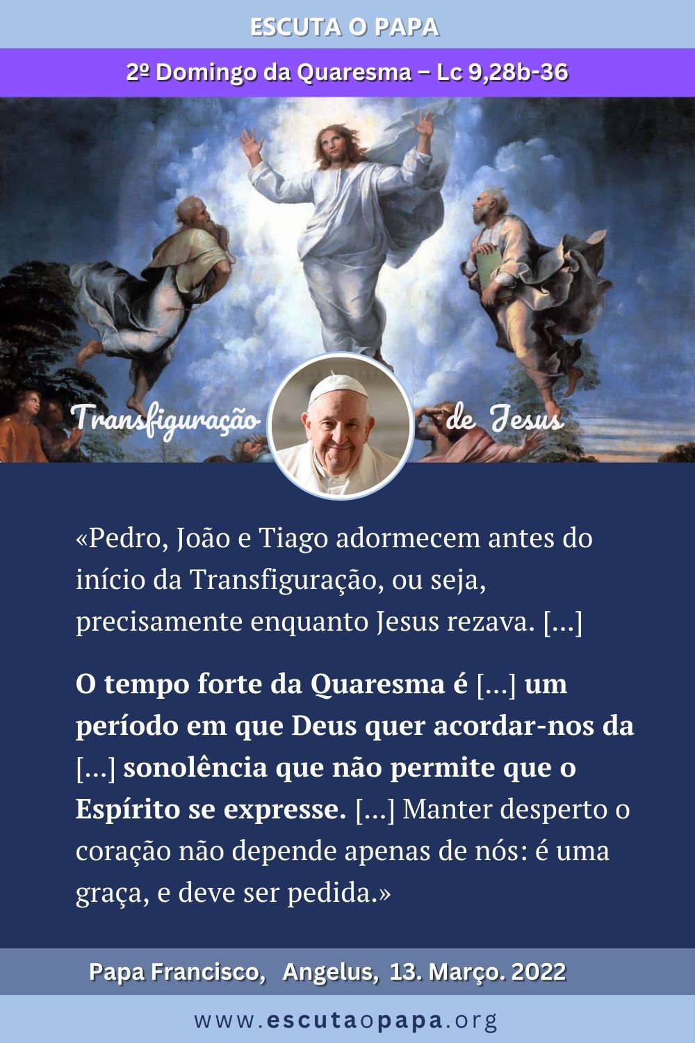 O Evangelho da Liturgia deste segundo Domingo de Quaresma narra a Transfiguração de Jesus (cf. Lc 9, 28-36). Enquanto Ele reza no alto de um monte, muda de aparência, a sua veste torna-se branca e radiante, e na luz da sua glória aparecem Moisés e Elias, que falam com Ele da Páscoa que o espera em Jerusalém, ou seja, da sua paixão, morte e ressurreição. Testemunhas deste acontecimento extraordinário são os apóstolos Pedro, João e Tiago, que subiram ao monte com Jesus.[…] O evangelista Lucas observa que «Pedro e os seus companheiros tinham-se deixado vencer pelo sono» e que «ao despertar» viram a glória de Jesus. […]