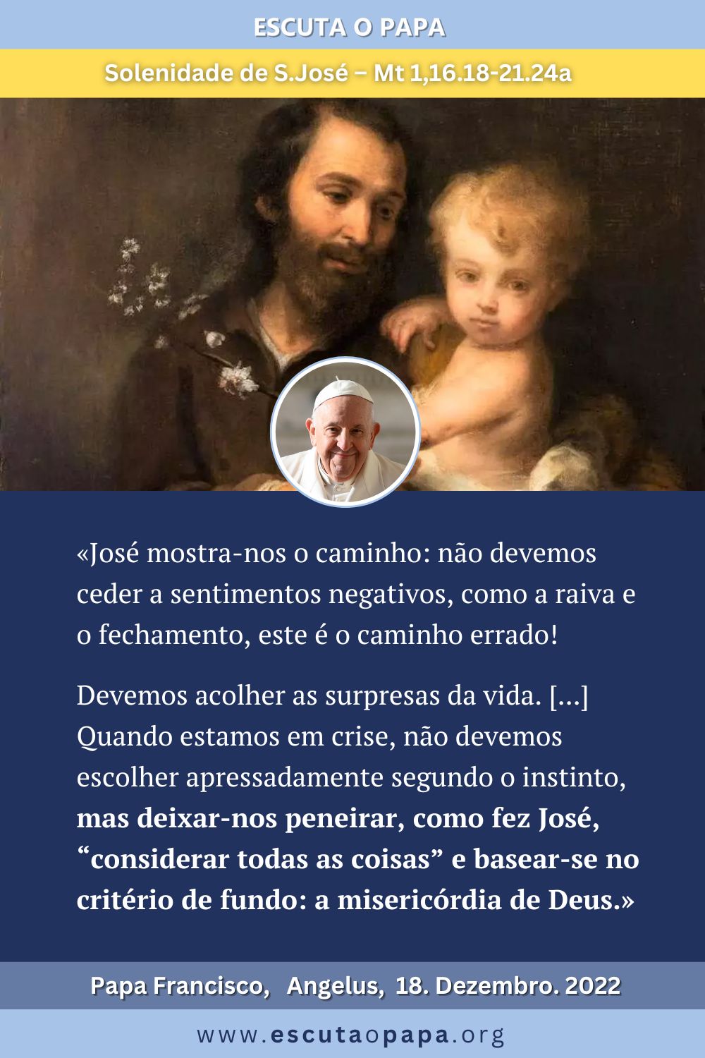 Irmãos, irmãs, o que nos diz José hoje? Também nós temos os nossos sonhos […]. Talvez lamentemos alguns sonhos quebrados, e vemos que as melhores expetativas são frequentemente confrontadas com situações inesperadas e desconcertantes. E quando isto acontece, José mostra-nos o caminho: não devemos ceder a sentimentos negativos, como a raiva e o fechamento, este é o caminho errado!