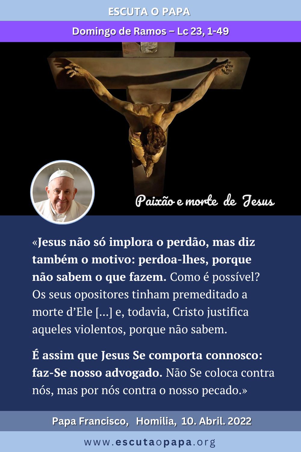 No calvário, confrontam-se duas mentalidades; vemos, no Evangelho, como as palavras de Jesus crucificado se contrapõem às dos seus adversários. Estes vão repetindo, como se fosse um refrão, «salva-te a ti mesmo». Dizem-no os chefes; […] Proferem-no os soldados […]. E também um dos malfeitores […]. Salvar-se a si mesmo, olhar por si mesmo, nos próprios interesses; […] é o refrão da humanidade, que crucificou o Senhor. […] Mas, à mentalidade do «eu», opõe-se a de Deus; o salva-te a ti mesmo confronta-se com o Salvador que Se oferece a Si mesmo. No Calvário, […] também Jesus toma a palavra três vezes como os seus adversários. […]. Particularmente uma das suas expressões marca a diferença do salva-te a ti mesmo: «Perdoa-lhes, Pai». Detenhamo-nos nestas palavras. Quando são pronunciadas pelo Senhor? […] Durante a crucifixão. […]. Lá, na dor física mais aguda da Paixão, Cristo pede perdão para quem O está perfurando. […] Cravado no patíbulo da humilhação, aumenta a intensidade do dom, que se torna “perdão”. É […] daqueles orifícios de dor causados pelos nossos cravos que brota o perdão. […]. Fixemos Jesus na cruz e vejamos que nunca recebemos um olhar mais terno e compassivo. […]. Fixemos o Crucificado e digamos: «Obrigado, Jesus! Amas-me e perdoas-me sempre, mesmo quando me custa amar e perdoar a mim mesmo».