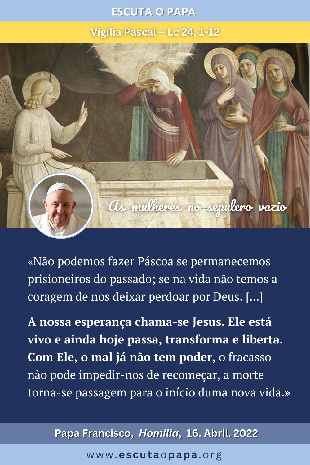 Em segundo lugar, as mulheres escutam. Depois de terem visto o sepulcro vazio, dois homens em trajes resplandecentes disseram-lhes: «Porque buscais o Vivente entre os mortos? Não está aqui; ressuscitou!». […] Sempre que pretendemos ter entendido tudo acerca de Deus […] repitamos a nós mesmos: não está aqui! Sempre que O procuramos apenas nas emoções […] ou nos momentos de necessidade, para depois O deixarmos de lado […] nas opções concretas de cada dia, repitamos: não está aqui! E quando pensamos em confiná-Lo nas […] nas nossas fórmulas e nas nossas tradições, mas esquecendo-nos de O procurar nos cantos mais escuros da vida onde há alguém que chora, que luta, sofre e espera, repitamos: não está aqui! […] Não podemos fazer Páscoa […] se permanecemos prisioneiros do passado; se na vida não temos a coragem de nos deixar perdoar por Deus – que perdoa tudo […] [e] que deseja transformar-nos a nós e ao mundo.[…]