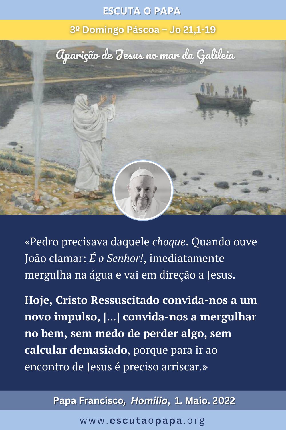 Pedro precisava daquele “choque”. Quando ouve João clamar: «É o Senhor!», mergulha imediatamente na água e vai em direção a Jesus. Assim, enquanto João, o mais novo, reconhece o Senhor, é Pedro, o mais velho, que se lança para ir ao seu encontro. Naquele mergulho há todo o entusiasmo recém-descoberto de Simão Pedro.[…] Hoje Cristo Ressuscitado convida-nos a um novo impulso, […] convida-nos a mergulhar no bem sem medo de perder algo, sem calcular demasiado, porque para conhecer Jesus tem é preciso arriscar. […] Perguntemo-nos: sou capaz de algum ímpeto de generosidade, ou impeço os impulsos do coração?