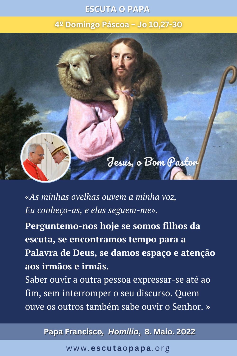 Em primeiro lugar, as ovelhas ouvem a voz do pastor. A iniciativa vem sempre do Senhor : […] é Ele que nos chama à comunhão com Ele. Mas esta comunhão acontece se nos abrirmos à escuta; […] Escutar significa disponibilidade, significa docilidade, significa tempo dedicado ao diálogo. […] Hoje somos esmagados por palavras, pela pressa de ter sempre de dizer alguma coisa, temos medo do silêncio. […] Mas para o Senhor, antes de mais, é preciso ouvir. Ele é a Palavra do Pai e o cristão é […] chamado a viver com a Palavra de Deus […]. Perguntemo-nos hoje se somos filhos da escuta, se encontramos tempo para a Palavra de Deus, se damos espaço e atenção aos irmãos e irmãs. Saber ouvir a outra pessoa expressar-se até ao fim, sem interromper o seu discurso. Quem ouve os outros também sabe ouvir o Senhor. […] E experimenta algo muito bom, isto é, que o próprio Senhor nos ouve […] quando rezamos, quando nos confidenciamos com Ele […].