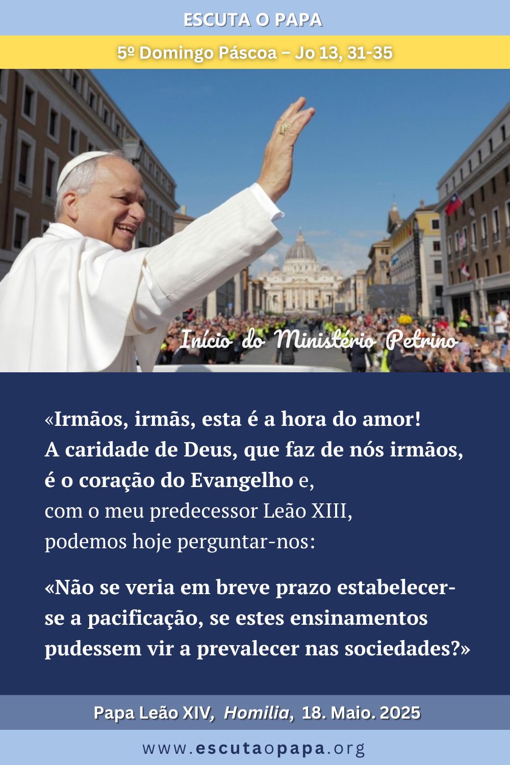 Irmãos e irmãs […] nos últimos dias, vivemos tempos particularmente intensos. A morte do Papa Francisco encheu os nossos corações de tristeza […]. No entanto, precisamente no dia de Páscoa, recebemos a sua última bênção e, à luz da ressurreição, enfrentámos este momento na certeza de que o Senhor nunca abandona o seu povo […]. Neste espírito de fé, o Colégio Cardinalício reuniu-se para o Conclave. […] Colocámos nas mãos de Deus o desejo de eleger o novo sucessor de Pedro, […] um pastor capaz de guardar o rico património da fé cristã e, ao mesmo tempo, de […] ir ao encontro das interrogações, das inquietações e dos desafios de hoje. Acompanhados pela vossa oração, sentimos a ação do Espírito Santo, que soube harmonizar os diferentes instrumentos musicais e fez vibrar as cordas do nosso coração numa única melodia. Fui escolhido sem qualquer mérito e, com temor e tremor, venho até vós como um irmão que deseja fazer-se servo da vossa fé e da vossa alegria, percorrendo convosco o caminho do amor de Deus, que nos quer a todos unidos numa única família.