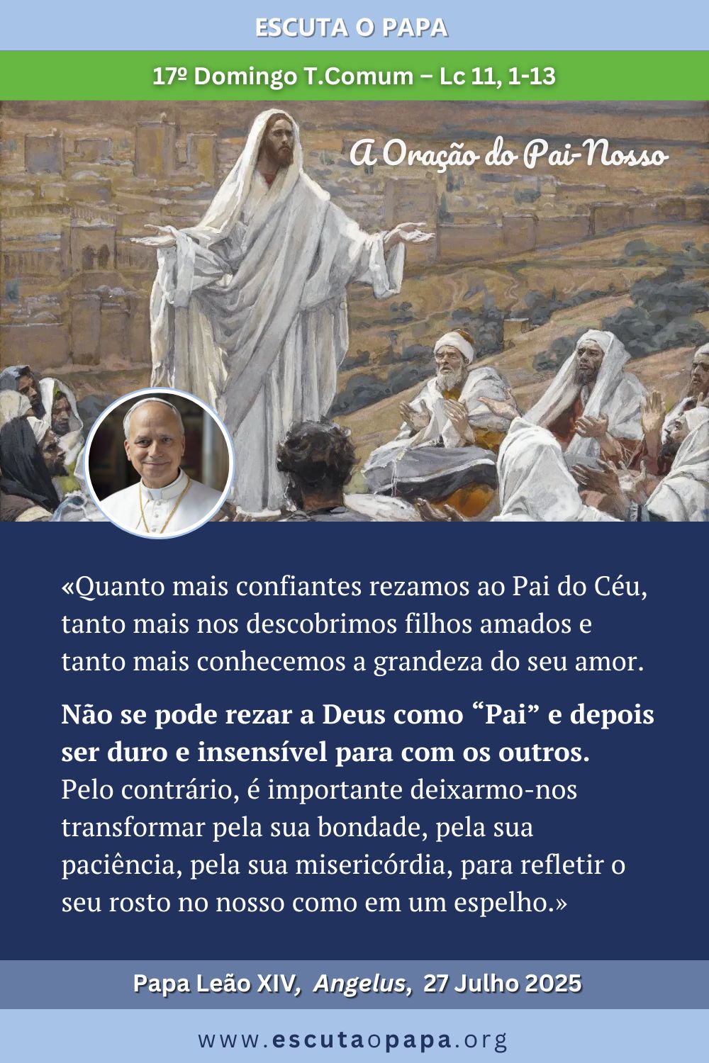 O Evangelho de hoje (Lc 11, 1-13) descreve os traços da paternidade de Deus por meio de algumas imagens sugestivas: a de um homem que se levanta no meio da noite para ajudar um amigo a acolher uma visita inesperada; ou a de um pai que tem o cuidado de dar coisas boas aos seus filhos. Estas imagens recordam-nos que Deus nunca nos vira as costas quando nos dirigimos a Ele, nem mesmo se chegamos tarde para bater à sua porta, talvez depois de erros, de oportunidades perdidas,[…] nem mesmo se, para nos acolher, Ele tiver de “acordar” os seus filhos que dormem em casa. Pelo contrário, na grande família da Igreja, o Pai não hesita em tornar-nos todos participantes de cada um dos seus gestos de amor. O Senhor escuta-nos sempre que rezamos, e, se por vezes nos responde em momentos e formas difíceis de compreender, é porque age com uma sabedoria e uma providência maiores, que estão para além da nossa compreensão. Por isso, mesmo nestes momentos, não deixemos de rezar; e rezar com confiança: n’Ele encontraremos sempre luz e força.