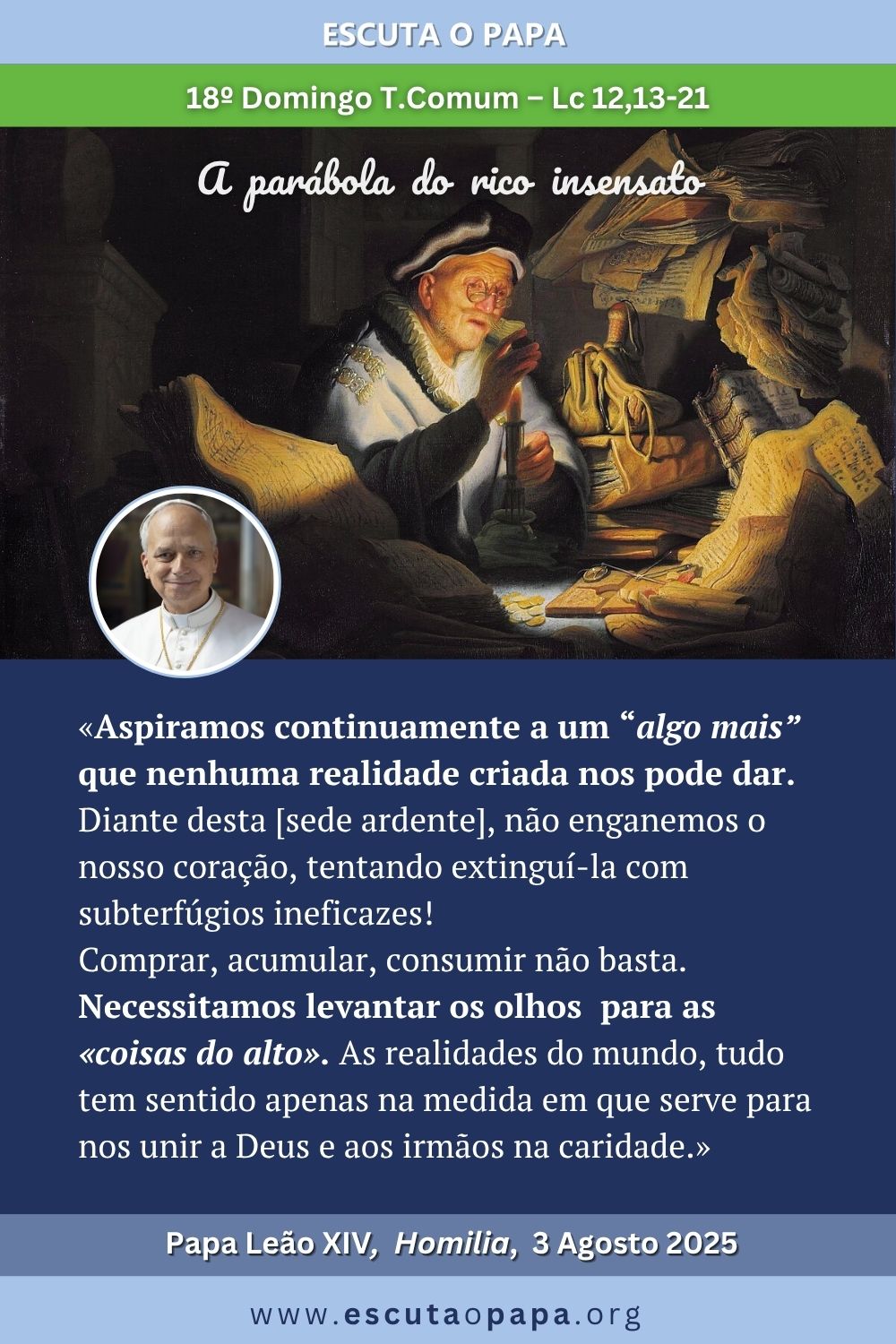 Há uma solicitação importante no nosso coração, uma necessidade de verdade que não podemos ignorar, que nos leva a perguntar: o que é realmente a felicidade? […] O que nos liberta dos pântanos do absurdo, do tédio, da mediocridade? […] A plenitude da nossa existência não depende do que acumulamos nem do que possuímos, como ouvimos no Evangelho (Lc 12, 13-21). Em vez disso, está ligada ao que sabemos acolher e partilhar com alegria. Comprar, acumular, consumir não basta. Necessitamos levantar os olhos, olhar para cima, para as «coisas do alto» (Cl 3, 2-13), para perceber que, entre as realidades do mundo, tudo tem sentido apenas na medida em que serve para nos unir a Deus e aos irmãos na caridade, fazendo crescer em nós «sentimentos de misericórdia, de bondade, de humildade, de mansidão, de paciência», de perdão, de paz, como os de Cristo.[…]