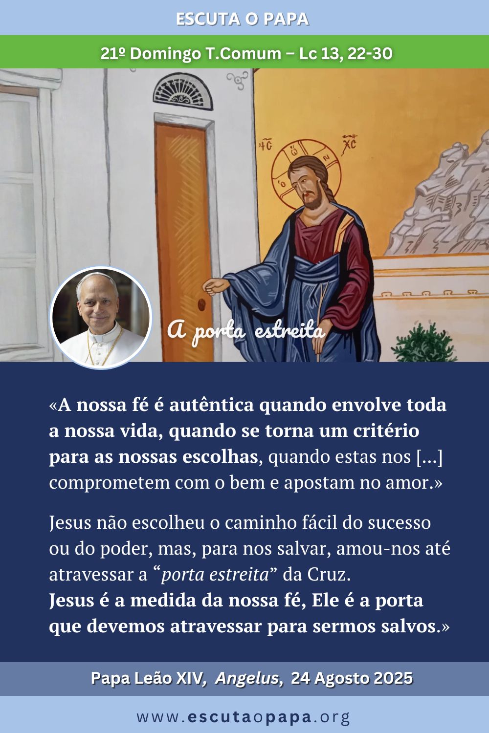 Irmãos e irmãs, é bonita a provocação que nos chega do Evangelho de hoje: ao mesmo tempo que nós, às vezes, julgamos quem está longe da fé, Jesus põe em crise “a segurança dos crentes”. Com efeito, diz-nos que não basta professar a fé com palavras, comer e beber com Ele celebrando a Eucaristia ou conhecer bem os ensinamentos cristãos. A nossa fé é autêntica quando envolve toda a nossa vida, quando se torna um critério para as nossas escolhas, quando nos torna mulheres e homens que se comprometem com o bem e apostam no amor, tal como fez Jesus; Ele não escolheu o caminho fácil do sucesso ou do poder, mas, para nos salvar, amou-nos até atravessar a “porta estreita” da Cruz. Ele é a medida da nossa fé, Ele é a porta que devemos atravessar para sermos salvos (cf. Jo 10, 9), vivendo o seu amor e tornando-nos, com a própria vida, agentes de justiça e paz.