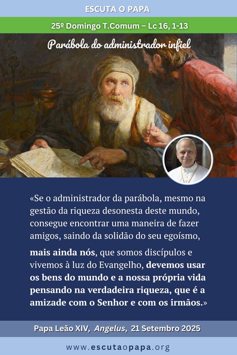 A parábola que hoje ouvimos no Evangelho (Lc 16, 1-13) faz-nos refletir sobre o uso dos bens materiais e, de um modo geral, sobre como temos administrado o bem mais precioso de todos, que é a nossa própria vida. Nesta história, vemos que um administrador é chamado pelo seu senhor a «prestar contas». Trata-se duma imagem que nos diz algo importante: não somos senhores da nossa vida nem dos bens de que gozamos; tudo nos foi dado como dom pelo Senhor, que confiou este património ao nosso cuidado, à nossa liberdade e responsabilidade. Um dia seremos chamados a prestar contas do modo como administramos a nossa vida, os nossos bens e os recursos da terra, tanto perante Deus como perante os seres humanos, a sociedade e, sobretudo, aqueles que virão depois de nós.