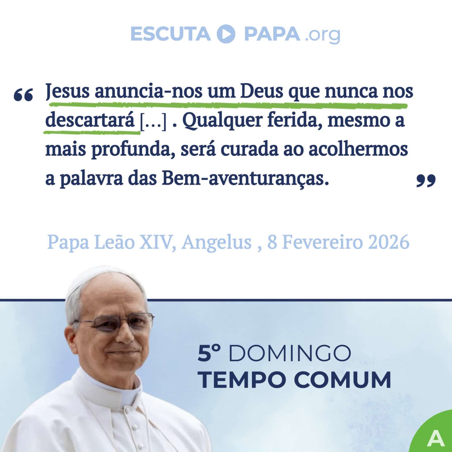 Quantas pessoas – e talvez já tenha acontecido também conosco – se sentem descartáveis, imperfeitas. É como se a sua luz tivesse sido escondida. Jesus, porém, anuncia-nos um Deus que nunca nos descartará, um Pai que guarda o nosso nome, a nossa singularidade. Qualquer ferida, mesmo a mais profunda, será curada ao acolhermos a palavra das Bem-aventuranças e ao voltarmos a caminhar pela via do Evangelho.