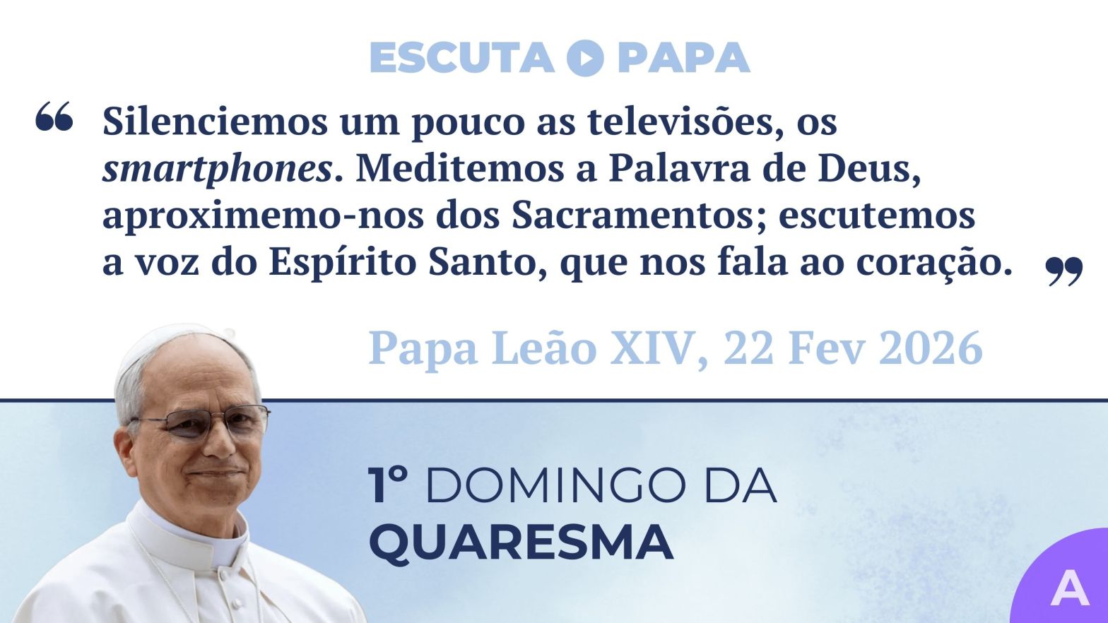 A Quaresma […] ensina-nos a ver antes o que nasce, o que cresce, impelindo-nos a servi-lo. É a profunda sintonia que, no segredo de quem jejua, reza e ama, se estabelece com o Deus da vida, Pai nosso e de todos. A Ele redirecionemos, com sobriedade e alegria, todo o nosso ser, todo o nosso coração.