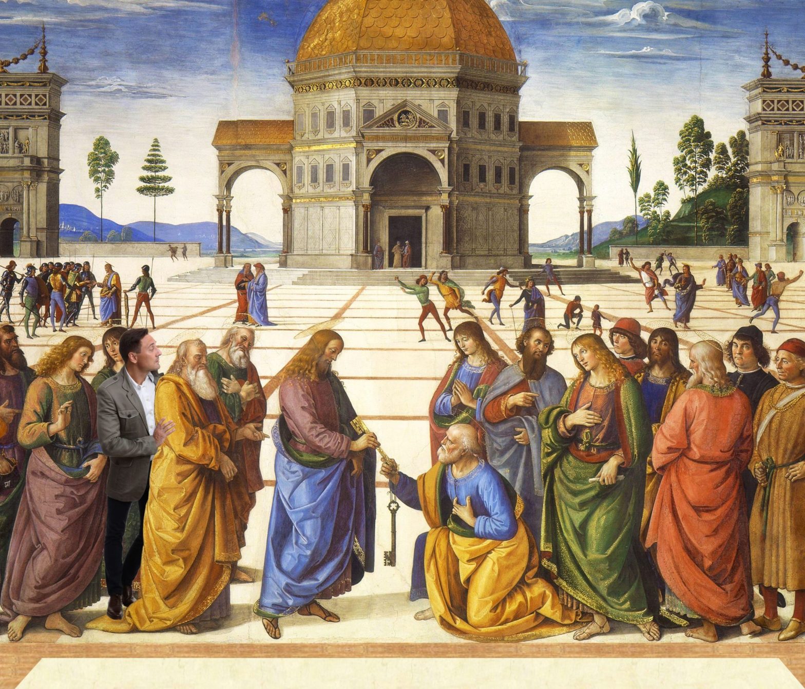 Remake usando IA, da pintura Entrega das chaves a São Pedro de Perugino (1482)